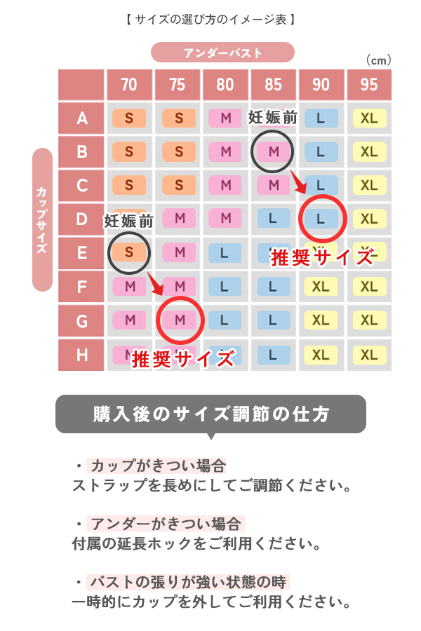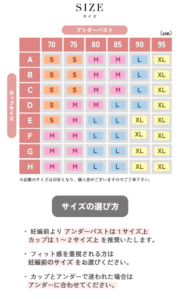 Sサイズ:(A70,B70,C70,D70,A75対応) Mサイズ:(B75,C75,D75,A80,B80対応) Lサイズ:(C80,D80,A85,B85,C85対応) XLサイズ:(D85,A90,B90,C90,D90対応) |