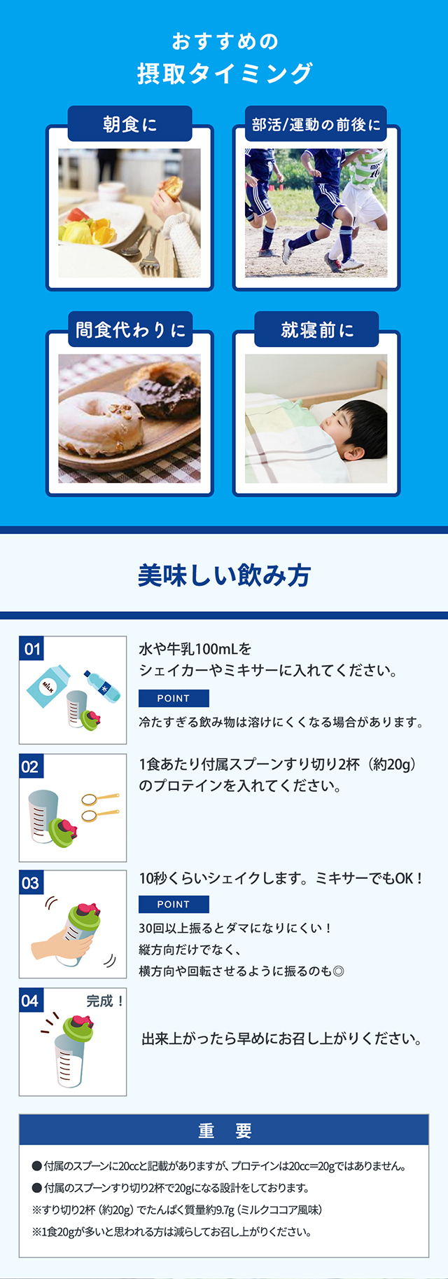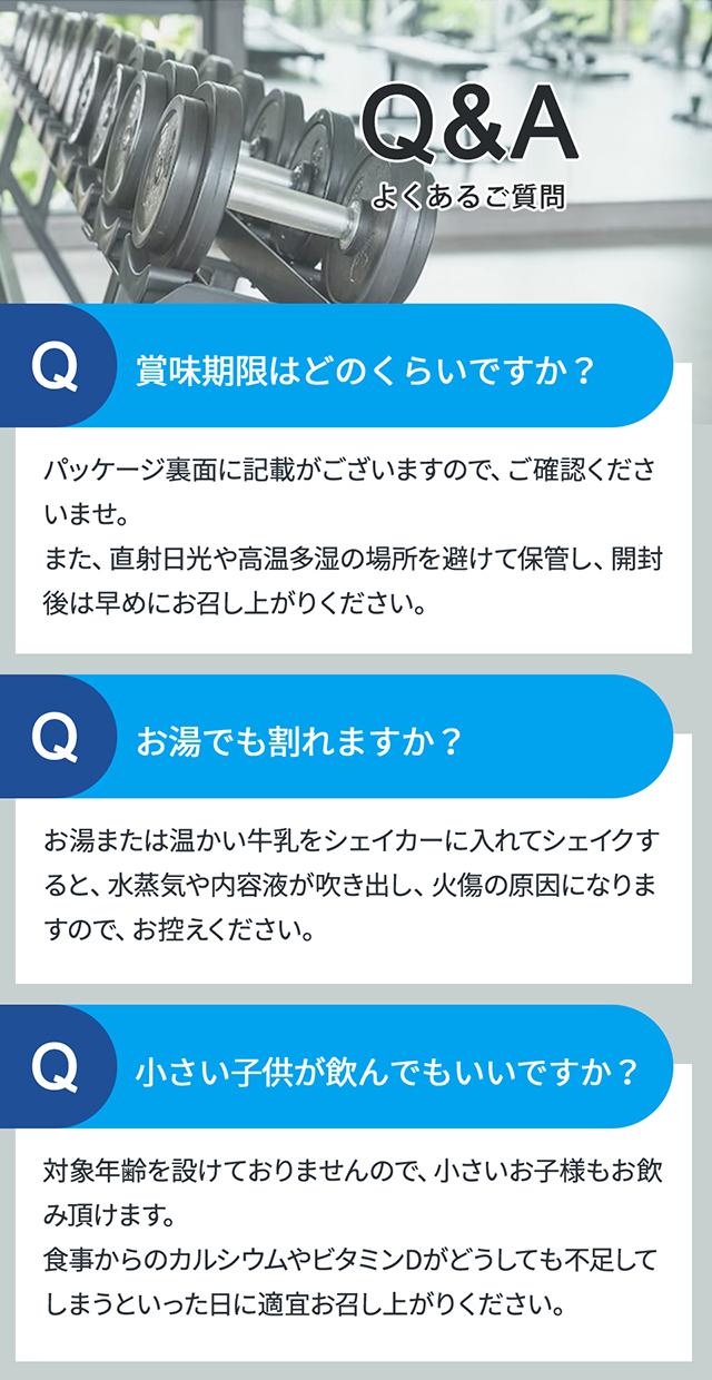 | 注意事項 | ・開封の際は、カッターやハサミのご使用をお控えいただくか、ご使用の際は中身を傷つけないよう十分ご注意ください。 ・本製造工場では、小麦、乳、卵、えび、いか、牛肉、さけ、さば、大豆、鶏肉、豚肉、やまいも、リンゴ、ゼラチン、バナナ、ごま、アーモンドを含む製品を生産しています。 ・あけくちや袋の端で手を切るなどのケガをしないようにご注意ください。 ・熱湯や温かい牛乳をシェイカーに入れてシェイクしないでください。水蒸気や内容液がふき出し、やけどの原因になります。 ・体調や健康状態によっては体に合わないことがあります。その場合は摂取を中止し、医師や専門家にご相談ください。 ・開封後は水やホコリ、髪の毛が入らないようにチャックをしっかりと閉め、直射日光や高温多湿の場所を避けて保存し、早めにお召し上がりください。 ・濡れたスプーンを袋の中に入れないでください。 ・製品中に濃い粒が見えることがあります。これは原料の一部で品質には問題ありません。 ・パッケージや処方リニューアルに伴い改良を行っておりますが、製品の品質に大きな変更はございませんのでご安心ください。詳細はパッケージ裏面をご確認ください。 ・妊娠、授乳中およびお薬を服用中の方は、医師とご相談の上ご利用ください。 |