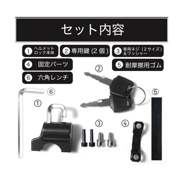 セット内容:本体、専用鍵×2、専用ネジ(2サイズ)&ワッシャー、固定パーツ、耐摩擦用ゴム、六角レンチ