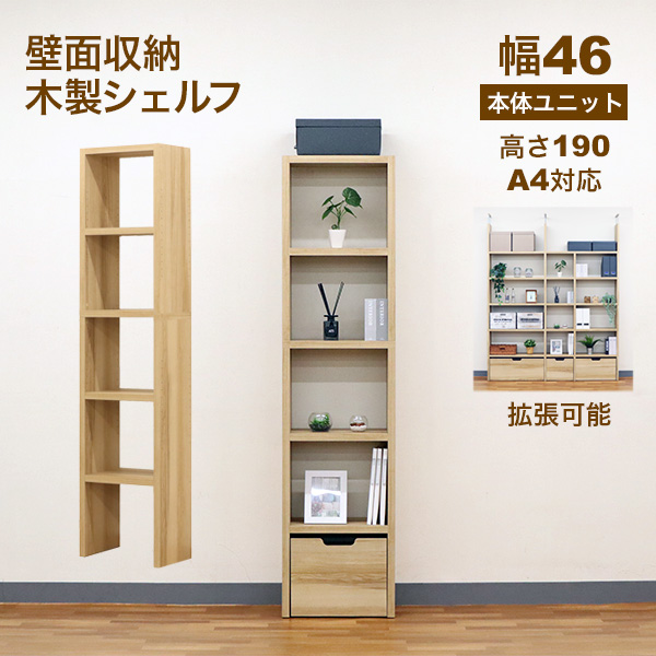 壁面収納 木製シェルフ 幅46 本体ユニット 高さ190 A4対応 拡張可能 の説明