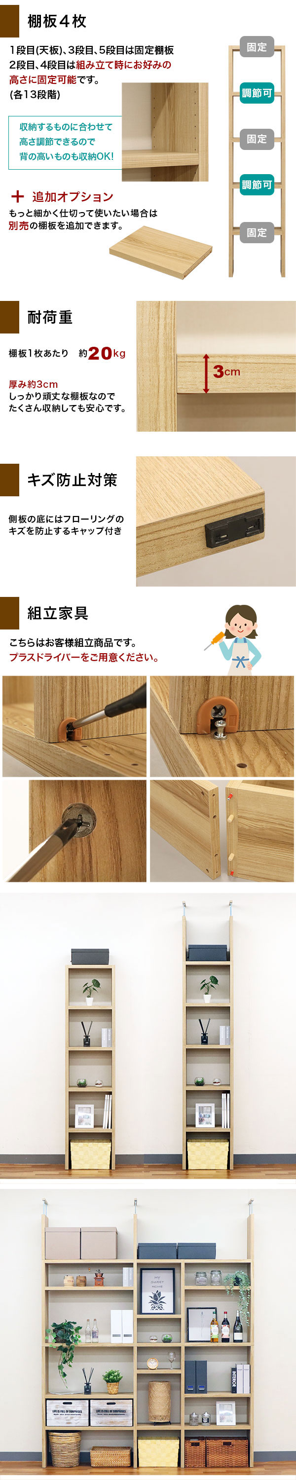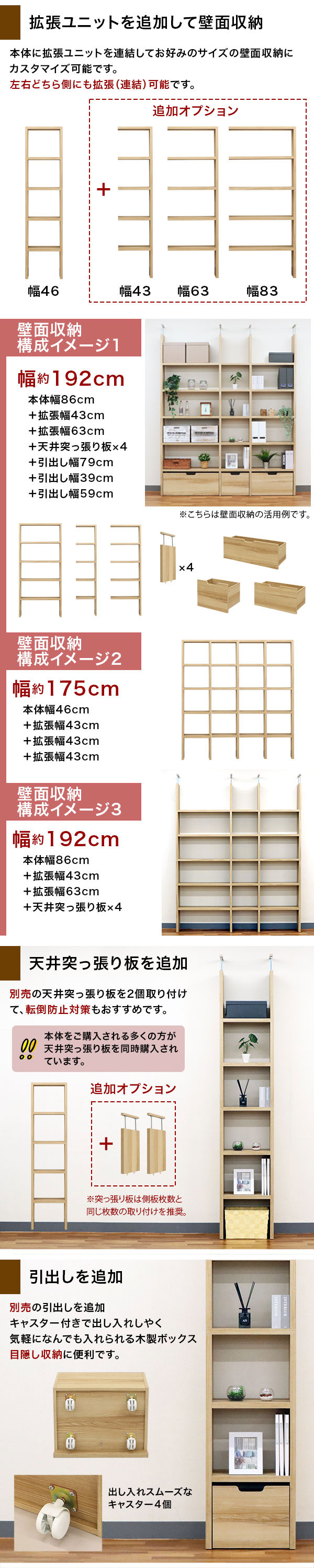 壁面に設置 ナチュラルテイスト お部屋の雰囲気に溶け込みやすい ナチュラルカラー 一般的なサイズのインナーボックスに対応 大きめな内寸 突っ張り板の板厚:1.8cm 最大伸長サイズ:15cm 全面に化粧処理 裏面も綺麗な仕上がり 部屋を仕切る 小物のディスプレイ用 転倒防止用突っ張り板(別売) 天井にしっかり固定 用途に合わせたサイズの収納棚を作ることが出来る 製品拡張 基本ユニット より収納スペースの広い収納棚を作ることが出来る