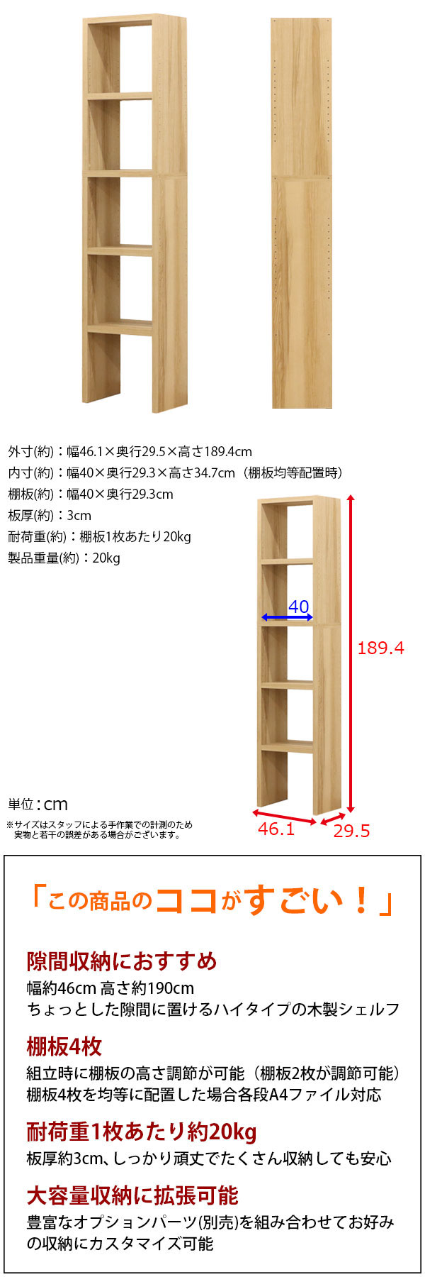 外寸(約):幅46.1×奥行29.5×高さ189.4cm