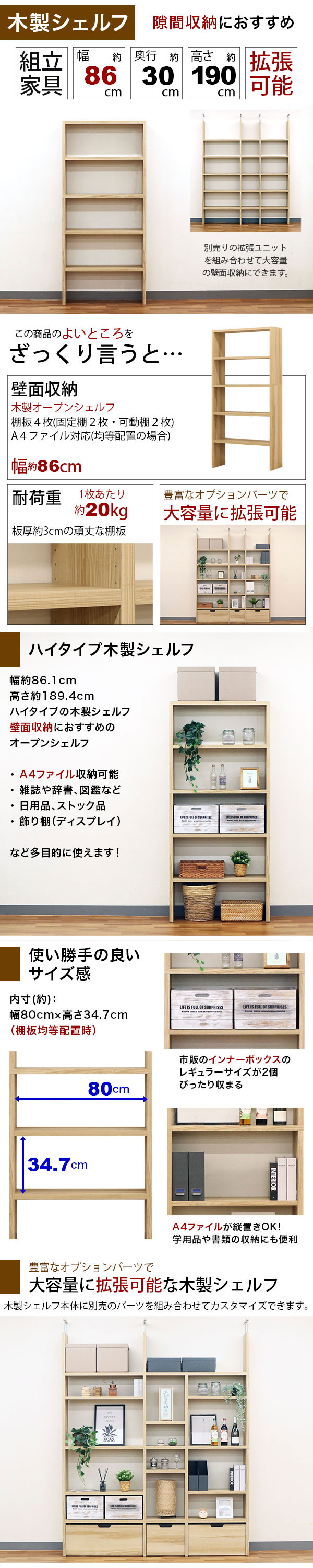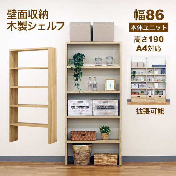 壁面収納 木製シェルフ 幅86 本体ユニット 高さ190 A4対応 拡張可能 の説明