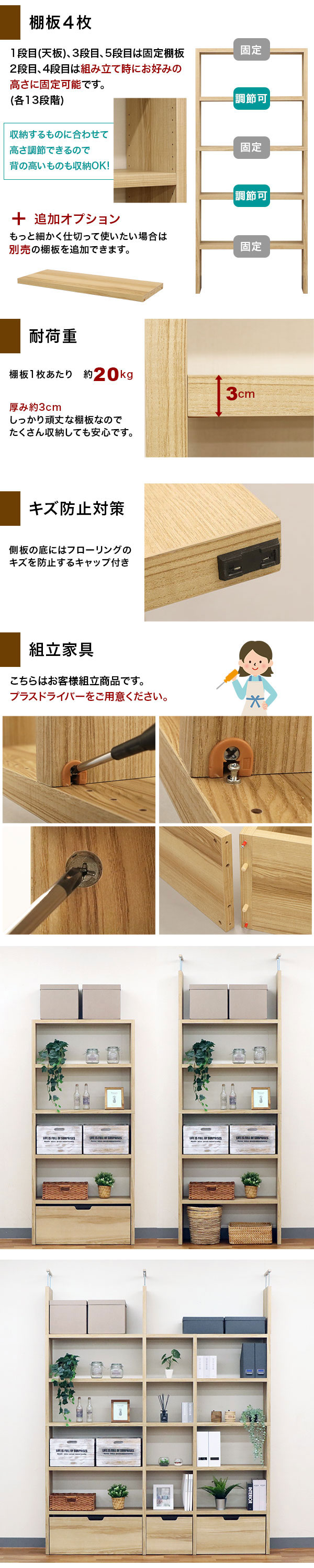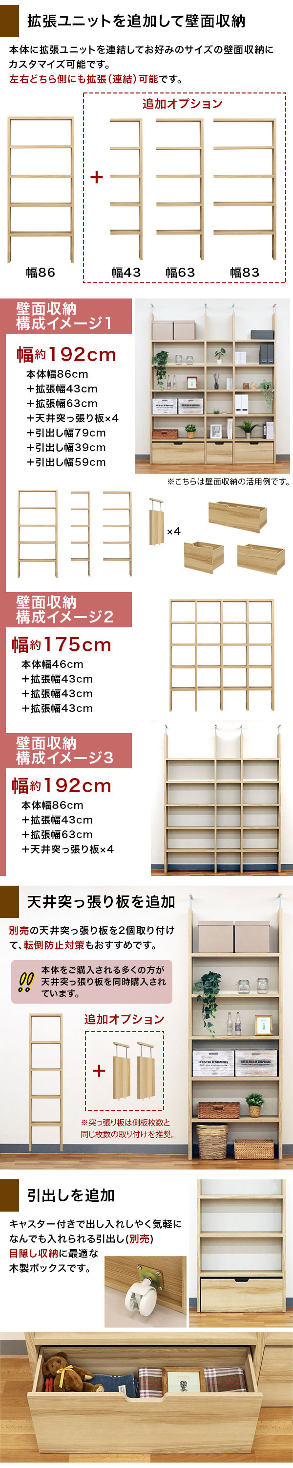 壁面に設置 ナチュラルテイスト お部屋の雰囲気に溶け込みやすい ナチュラルカラー 一般的なサイズのインナーボックスに対応 大きめな内寸 突っ張り板の板厚:1.8cm 最大伸長サイズ:15cm 全面に化粧処理 裏面も綺麗な仕上がり 部屋を仕切る 小物のディスプレイ用 転倒防止用突っ張り板(別売) 天井にしっかり固定 用途に合わせたサイズの収納棚を作ることが出来る 製品拡張 基本ユニット より収納スペースの広い収納棚を作ることが出来る
