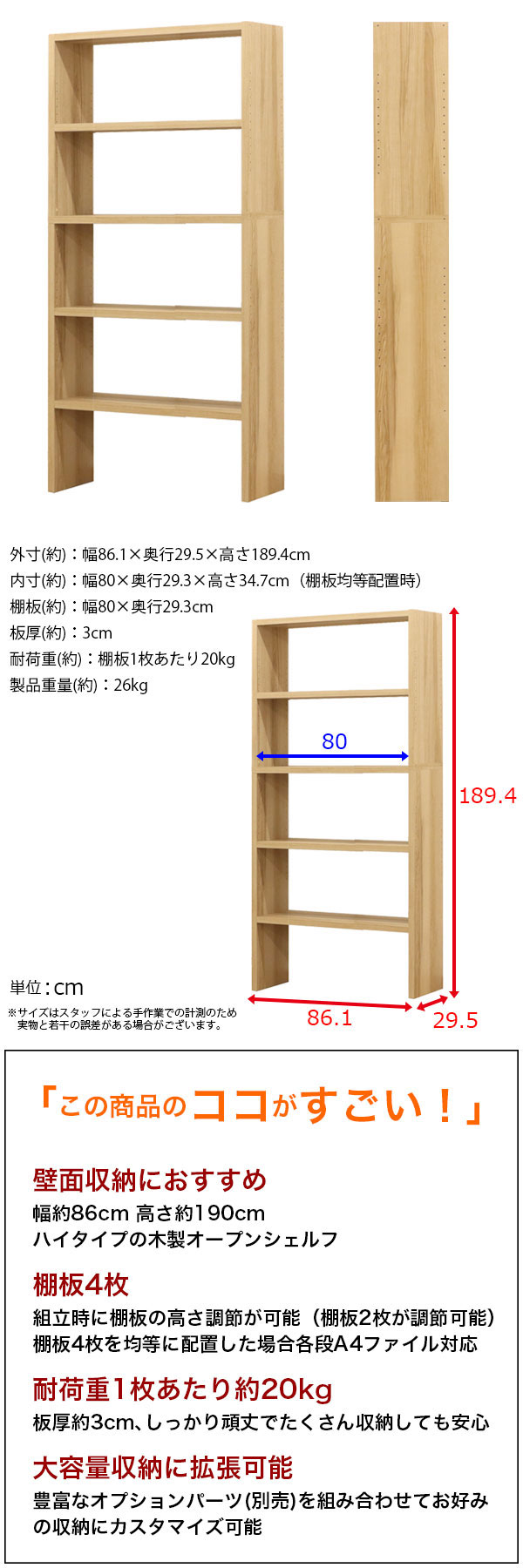 商品名:壁面収納 A4対応 本棚 オープンラック 拡張可能 幅86.1cm 奥行29.5cm(約30cm) 高さ189.4cm(約190cm) 大容量 収納棚 収納ラック シンプルナチュラル おしゃれ A4ファイル ランドセル 学用品 おもちゃ お道具箱 絵具セット 習字セット 教科書 絵本 楽譜 オフィス収納 内寸幅80 カスタマイズ可能な北欧風モジュラーシェルフ モジュールシェルフ モジュールラック 丈夫な壁面ラック 耐久性があるオープンシェルフ 見た目がきれいなマガジンラック カスタム可能な 高品質なディスプレイラック 収納力が高いブックシェルフ たくさん収納できるウォールラック 収納アイディア 収納テクニック 絵本棚 壁面本棚 ベースユニット