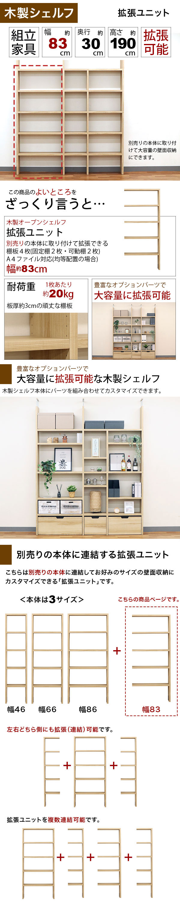 木製シェルフ 拡張ユニット 幅83 高さ190 A4対応 の説明