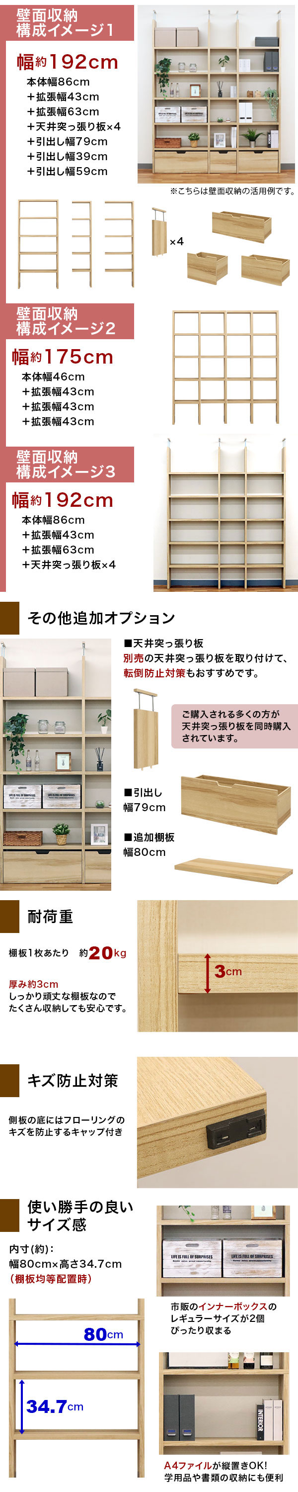 商品名:壁面収納 A4対応 本棚 オープンラック用の拡張パーツ83幅(オプションユニット) 拡張可能 幅83.1cm 奥行29.5cm(約30cm) 高さ189.4cm(約190cm) 大容量 収納棚 収納ラック シンプルナチュラル おしゃれ A4ファイル ランドセル 学用品 おもちゃ お道具箱 絵具セット 内寸幅80 習字セット 教科書 絵本 楽譜 オフィス収納 カスタマイズ可能な北欧風モジュラーシェルフ モジュールシェルフ モジュールラック 丈夫な壁面ラック 耐久性があるオープンシェルフ 見た目がきれいなマガジンラック カスタム可能な 高品質なディスプレイラック 収納力が高いブックシェルフ たくさん収納できるウォールラック 収納アイディア 収納テクニック 絵本棚 壁面本棚 オプションユニット