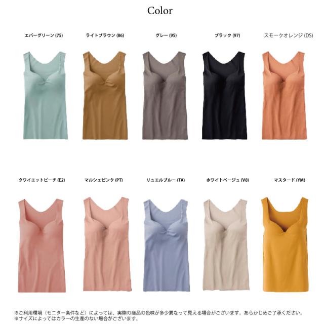 | 特徴 | KIREILABO(キレイラボ) 【Fitte】ブラタンクトップ 立体カップでシルエットがきれい。 【Fitte(フィッテ)】オーガニックコットン生まれの 立体シルエットインナーシリーズ。 人と自然の調和をテーマに、地球・人・環境にやさしい 立体美インナーです。 サイドに流れがちなバストラインを 一体型のモールドカップがしっかり整え、すっきりとしたシルエットを つくります。 生地端はきりっぱなしで低刺激。お肌にやさしく、 下着のラインが外にひびきにくくなります。 オーガニックコットン混のストレッチ素材が、体にやさしくフィットします。 アンダーゴムを無くし、背中からバストにかけての 締め付けを減らしました。 一枚でらくちん、そして美しいシルエットインナーです。 オールシーズン対応です。 ホック:無し(かぶりタイプ) パッド入れ:無し アンダーゴム:無し 脇縫い:あり ※オーガニックコットンの特性上、 色の付いた繊維が混入する場合があります。 |