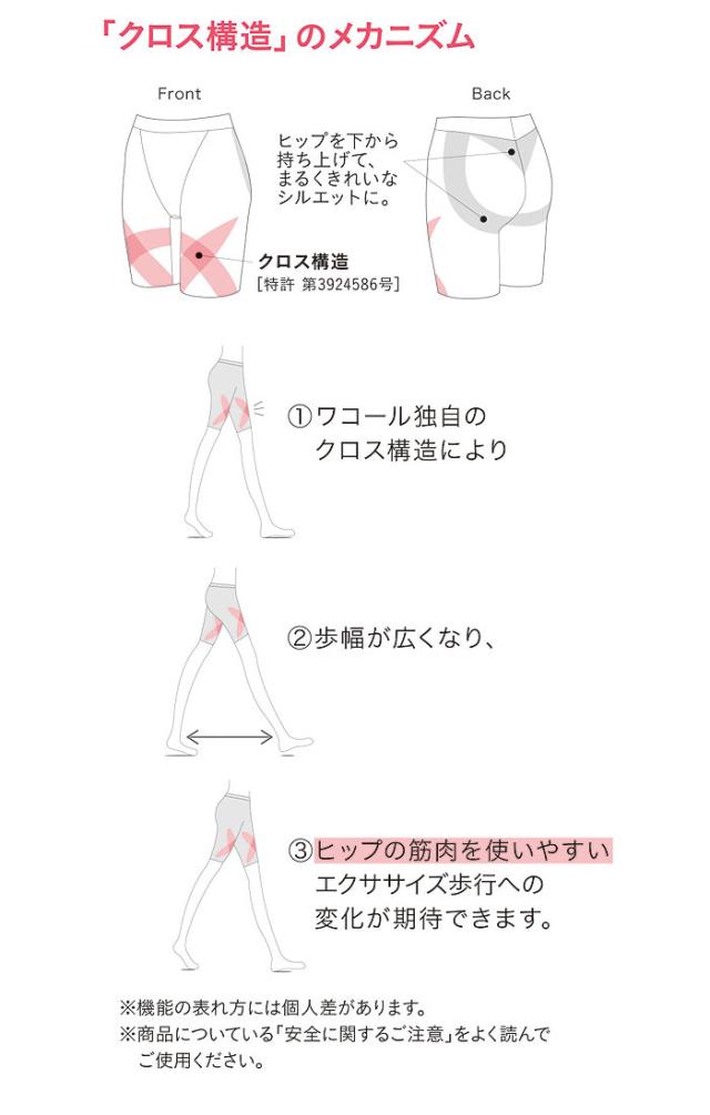 ワコール独自のクロス構造が歩くたびに太もも前側の筋肉に