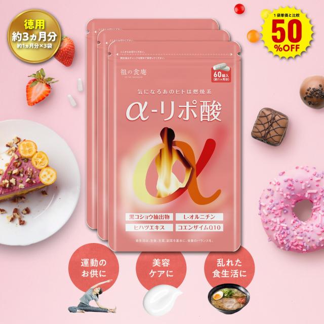 \【徳用】90日分まとめ買い半額!/30日分1,685円×3袋5,055円⇒送料無料2,527円!燃焼×美容の次世代ダイエットサプリ アルファ リポ酸 α-リポ酸 30日分 メール便 L-カルニチン との併用がオススメ コエンザイムQ10 チオクト酸 L-オルニチン ビタミンC ビタミンE