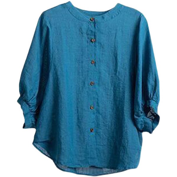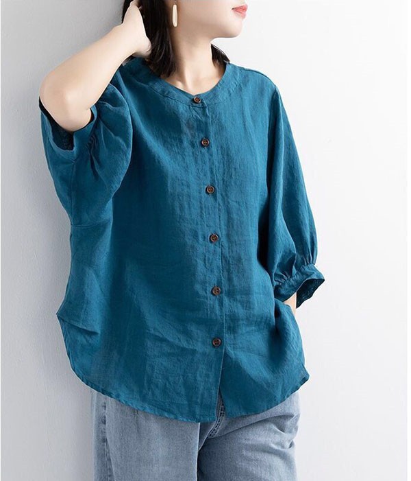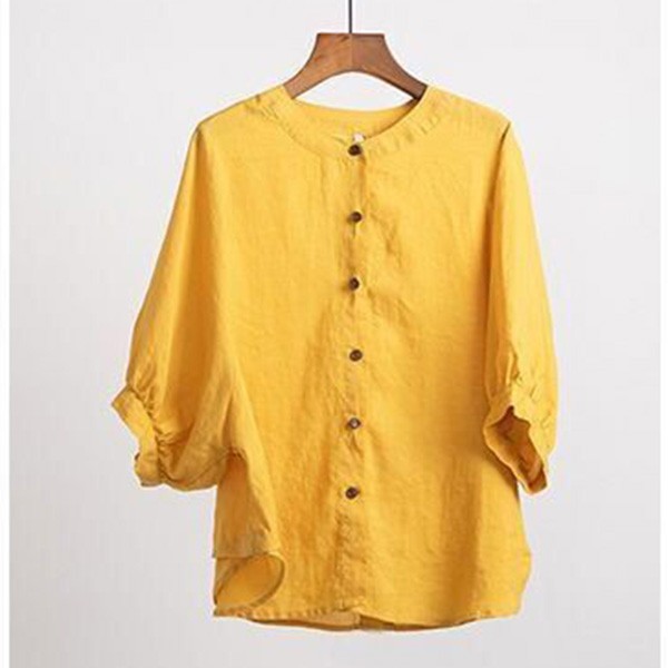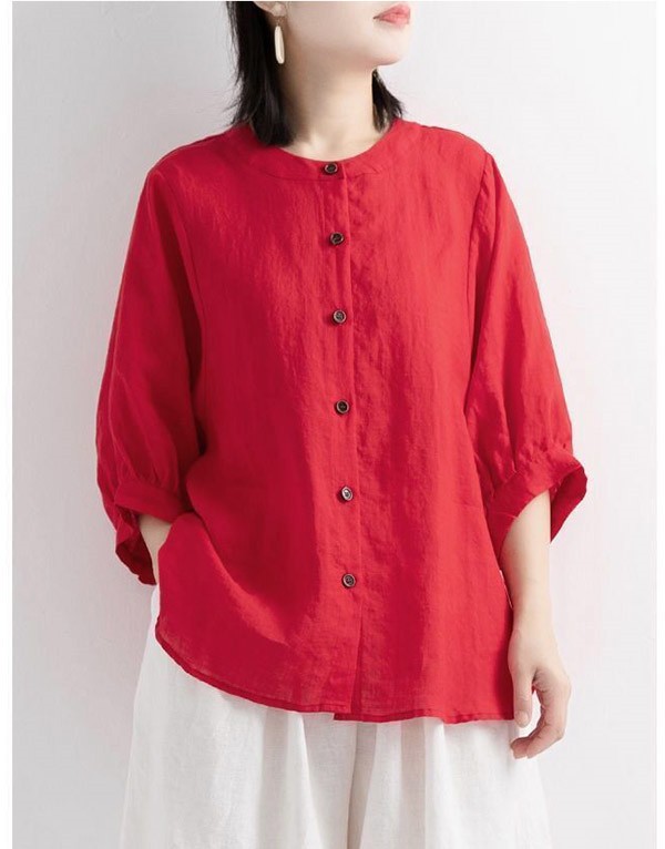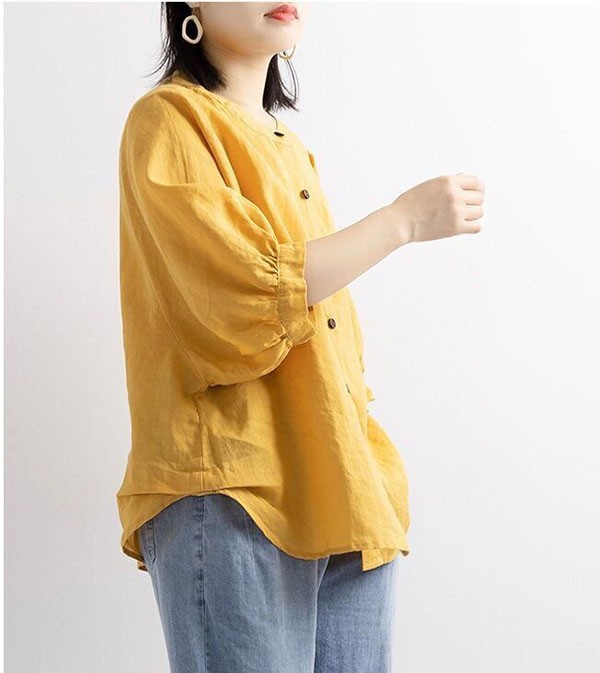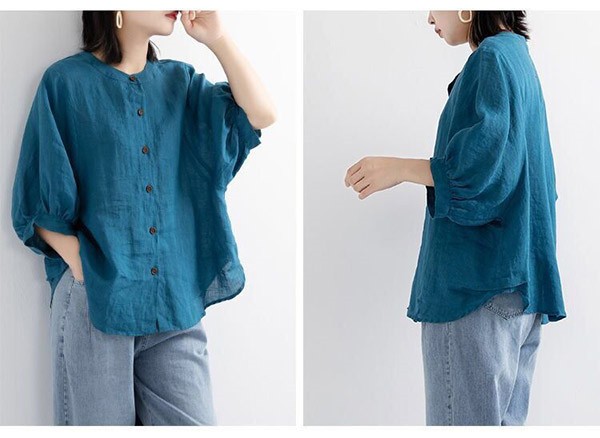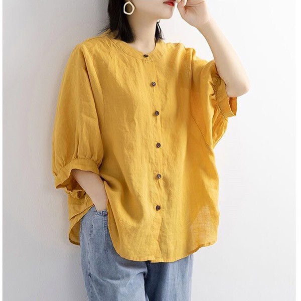 【レビュー投稿で+5%還元】リネンブラウス レディース 七分袖 リネンシャツ 綿麻混 トップス リネン混 コットン ブラウス コットンリネン おしゃれ スタンドカラー ボリューム袖 プルオーバー 前開き 無地 シンプル ナチュラル ゆったり 体型カバー カジュアル 春夏秋 通勤 OL