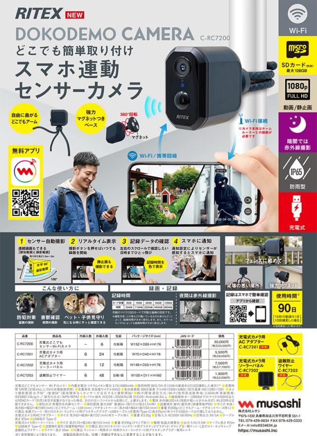 【46%引き】人感センサー 屋外 防犯カメラ ムサシ 充電式どこでもセンサー Wi-Fiカメラ(C-RC7200) LED 取り付け簡単 赤外線撮影 動画 静止画 録画 配線不要 セキュリティ 防犯グッズ 家庭用 電源不要 wifi ワイヤレス 工事不要 ソーラー