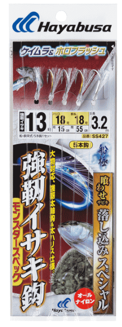 ハヤブサ hayabusa 船釣り サビキ 釣り 仕掛け 捌きやすさと取り込みやすさを重視したSS426の改良バージョン。4本鈎のためトラブルが少なく、また全長は4本鈎でありながら3mと長いため大物が取り込みやすい。 鈎はイサキ鈎の掛かりの良さは保持しつつ、線径を太軸化し更に強度を持たせた「強靭イサキ」を採用。胴打加工と直貼りしたホロシールのフラッシングでベイトの食性を刺激します。 ■品番:SS429 |