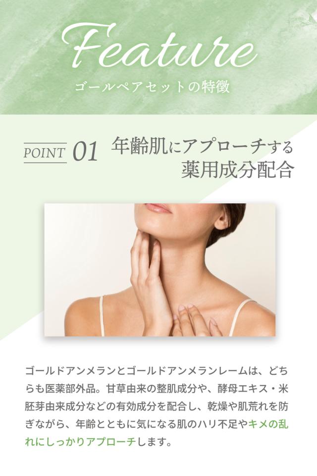 【ゴールドアンメラン 化粧水】 2020年度当サイト売上No1. 乾燥や肌荒れを防いで素肌の輝きを高める薬用化粧水。 肌をしっとり整えて、うるおい機能とバリア機能を助けます。 肌本来の美しさを引き上げて、いつまでもみずみずしく輝き続ける素肌美へ。 【ゴールドアンメランレーム クリーム】 化粧水で与えた美容水分をしっかり蓄えて、うるおい機能とバリア機能をサポート。 肌本来の美しさを引き上げます。 素肌に自然になじんで、みずみずしく輝き続ける素肌美へ。 |