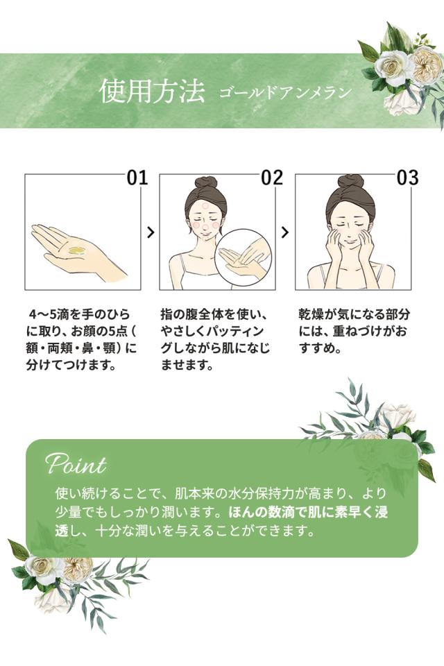 【ゴールドアンメラン 化粧水】 4〜5滴を手のひらに取り、顔の5点に分け、指腹全体を使ってやさしくパッティングしながらしっとりするまでなじませてください。 【ゴールドアンメランレーム クリーム】 化粧水や乳液でお肌を整えた後、小豆粒ほどの量を指先にとり、顔の5点に分けます。 指腹全体を使ってやさしくパッティングしながらしっとりするまでなじませてください。 |