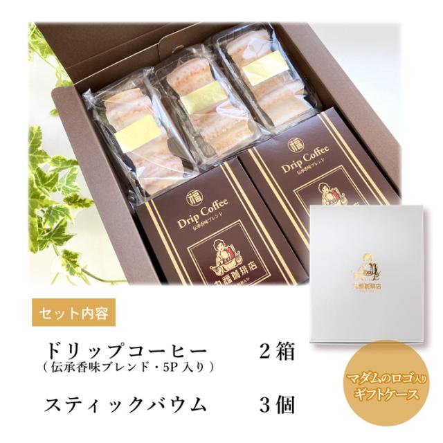 手土産 バレンタイン ギフト 珈琲 ドリップコーヒー2箱10袋と バウムクーヘン 3本 詰合せ スイーツ お取り寄せ 常温 公式 丸福珈琲店