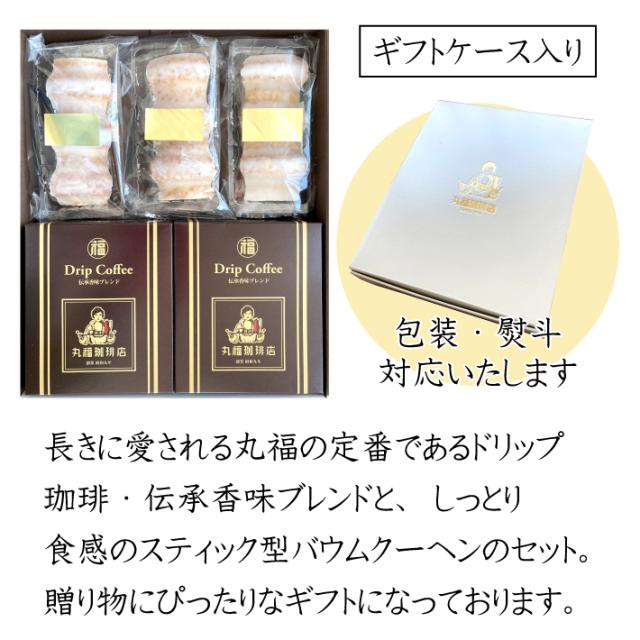 【送料無料】 丸福珈琲店 御歳暮 クリスマス 内祝い ギフト 伝承香味ブレンド ドリップバッグ 10袋と バウムクーヘン 3本 詰合せ 個包装 焼き菓子 スイーツ 常温