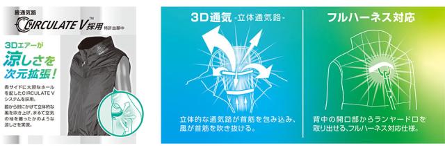 裏チタン加工、背中フルハーネス取出し口、一次撥水、3D通気衿、保冷剤入れ、CIRCULATE V、胸フック掛け