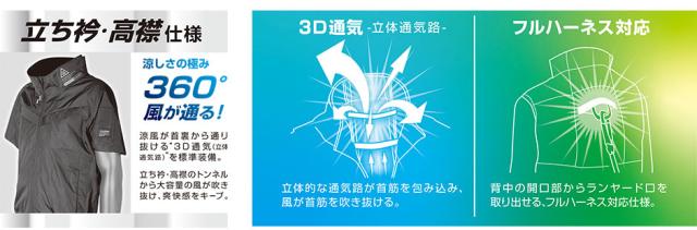 ◎仕様:脇ポケット、脇通気路CIRCULATE V、反射プリント、隠しフックハンガー取付ベルト、立体通気路、胸ポケット、バッテリーケーブルコードホール、保冷剤ポケット、背中フルハーネスランヤード取出し口