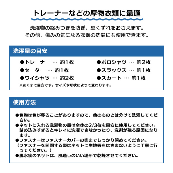 ネットに入れる洗濯物の量は全体の2/3くらいを目安に使用してください。