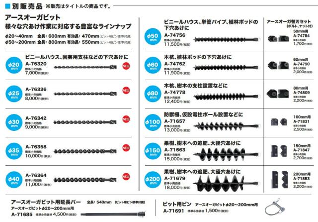 (マキタ) アースオーガビット φ40mm A-76364 有効長470mm 全長600mm ビット用ピン標準付属 充電式アースオーガ用ビット makita