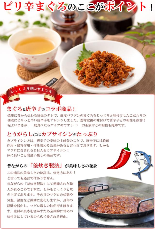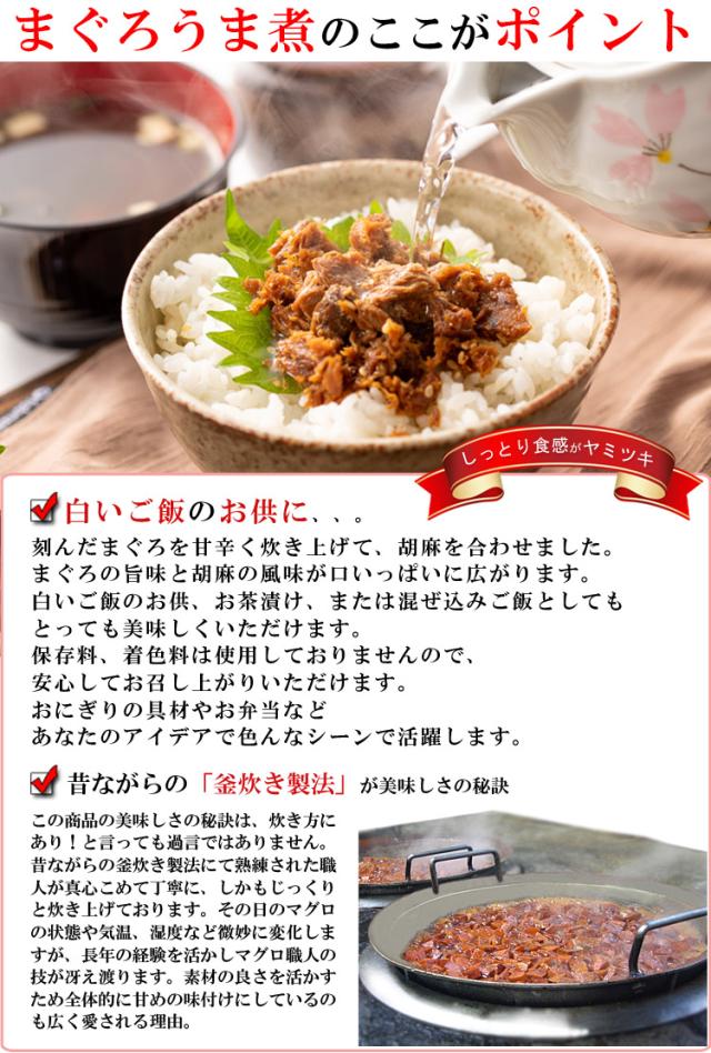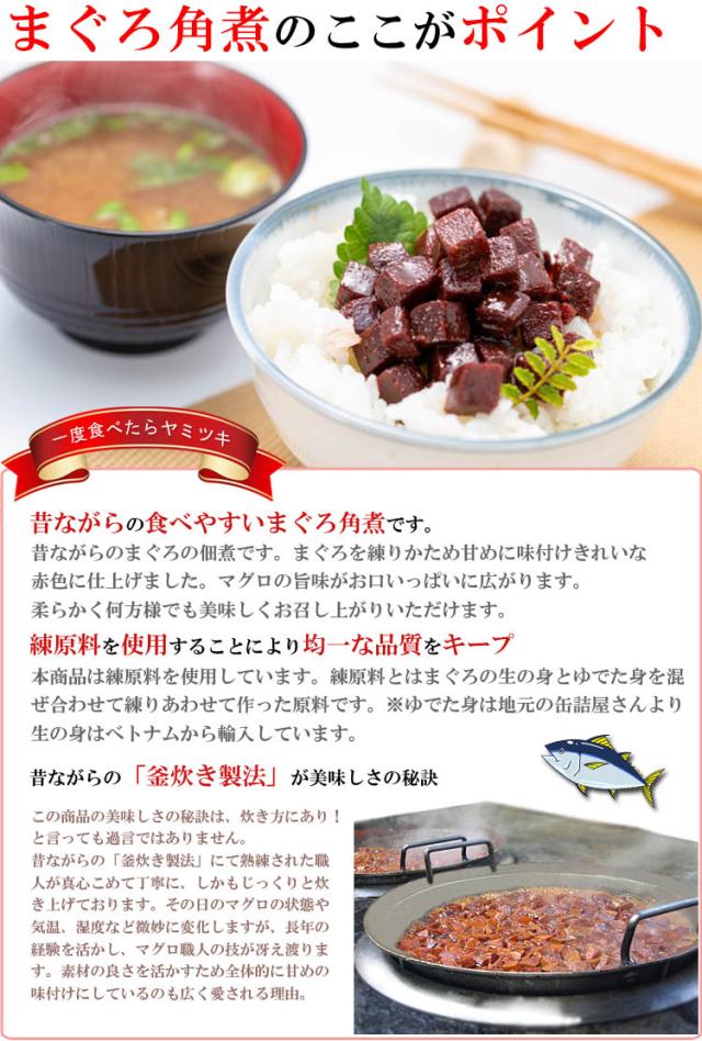 それぞれの鮪は、焼津に昔から伝わる秘伝のタレで、鮮度バツグンの素材をじ〜っくりと味付けしたこだわりの佃煮です。 しかもマグロの頭のお肉を使用したまぐろかぶと煮、まぐろの尻尾のお肉(まぐろ尾肉)の佃煮も大変好評の逸品。
