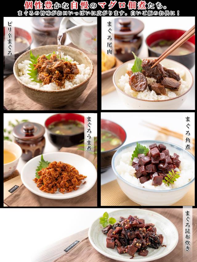 セット内容:まぐろうま煮(90g)、まぐろ角煮(140g)、まぐろ尾肉(90g)、まぐろ昆布(120g)、ピリ辛マグロ(90g)
