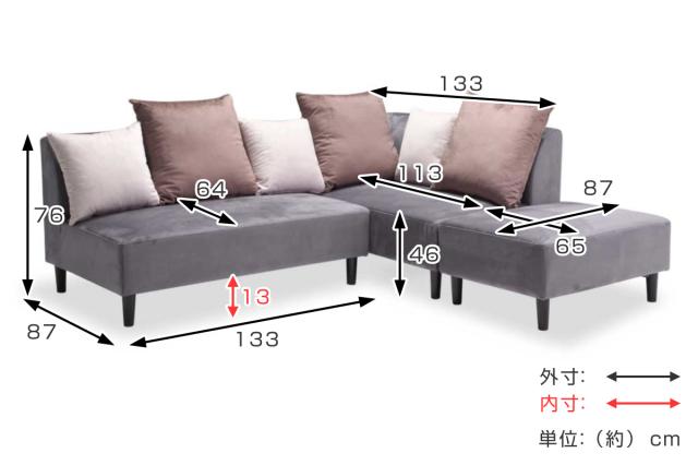 | サイズ | 2人掛けソファ:幅133×奥行87×高さ76(cm) カウチソファ:幅87×奥行133×高さ76(cm) スツール:幅87×奥行65×高さ46(cm) 座面高:約 46(cm) |