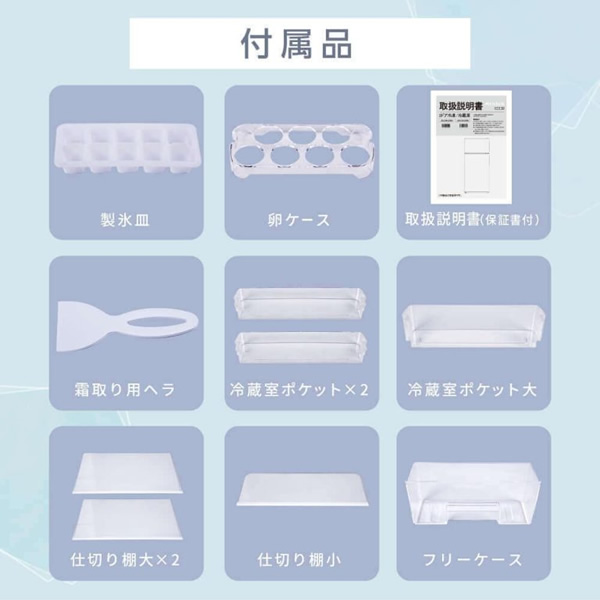 | 付属品 | 製氷皿、卵ケース、霜取り用ヘラ、冷蔵室ポケット:小×2、冷蔵室ポケット:大、仕切り棚:小、仕切り棚:大×2、フリーケース、取扱説明書(保証書付き) |
