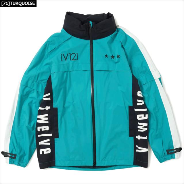 バックにV12 GOLF シーズンロゴがプリントされたレインジャケット。