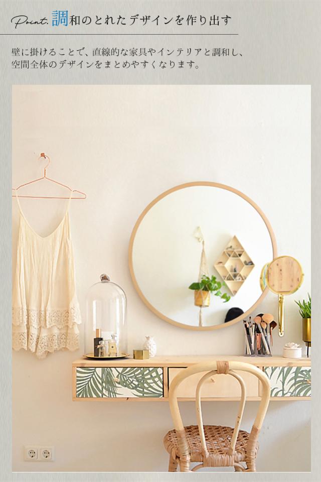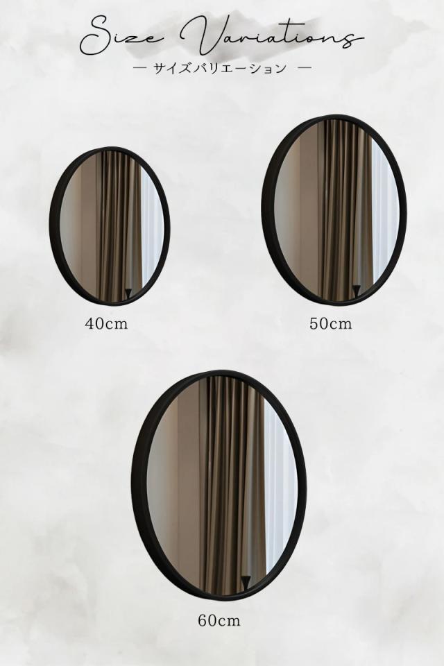 Wall Mirror 壁掛けミラー 飾るだけでインテリアの衣替え 。 お部屋のインテリアに柔らかい印象を与える丸型の壁掛けミラー。 丸い形状のミラーは独特の美しさや部屋の雰囲気を優しく包み込むような存在感があります。 廊下やエントランスなど狭い場所に飾ると、空間を広く見せるための効果も◎ シンプルデザインで置く場所を選ばないため、玄関や寝室・リビングやトイレ・洗面スペース、 自宅だけでなくお店でもお使い頂けるおしゃれなウォールミラーです。 丸い形は部屋を広く見せる効果や風水の視点から円滑に事を運びやすくなるとも言われております。 調和のとれたデザインを作り出す 壁に掛けることで、直線的な家具やインテリアと調和し、空間全体のデザインをまとめやすくなります。 スペースを広く見せる効果 角のない形状のため、リラックスした雰囲気を与え、空間を広く見せる効果があります。 高透過ガラスで綺麗に映る 高透過ガラスは一般的なガラスとは違い、ガラス特有の青みがなく、クリアな色味で姿を綺麗に映し出します。 そのため、美容室やアパレルショップなどでも取り扱われており、ご自宅でメイクやセットなどをされる方にもオススメ◎ 割れても破片が飛び散らない 鏡は飛散防止加工を施しています。 万が一鏡が割れたときに、大きな破片が飛び散りにくくなっております。 |