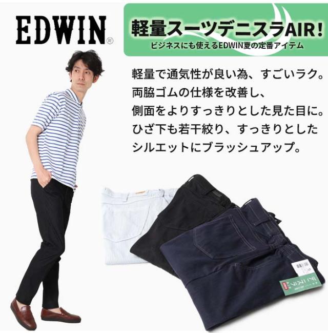 EDWIN エドウィン デニスラ エアー デニム スラックス ジーンズ ジーパン イージーパンツ チノパン 夏用 涼しい クール パンツ ズボン ストレッチ ラク 楽 綿 ビジネス 仕事用 スーツ アウトドア アメカジ ストリート メンズ 定番 カジュアル ブランド シンプル 大人 紳士 男性 黒 ブラック インディゴ ブルー ネイビー 春 夏