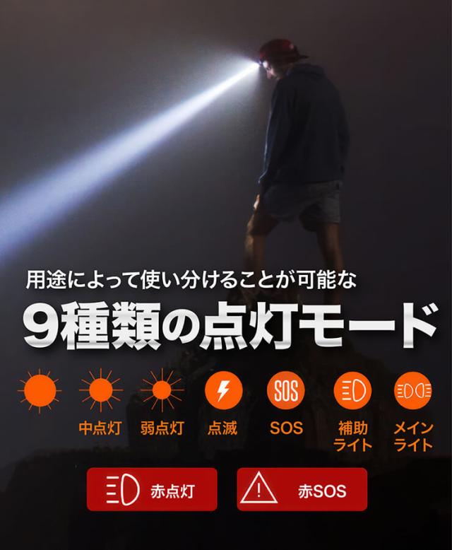【遠光・散光2種類/9つのモード】メインには遠光白色LED、サブには目に優しい散光LEDを搭載して、9つのモードに切り替わります。モードには遠光白色LED高、中、低、高速点滅、低速点滅、散光LED点灯、遠光・散光当時点灯、赤色点灯、赤色点滅があります。