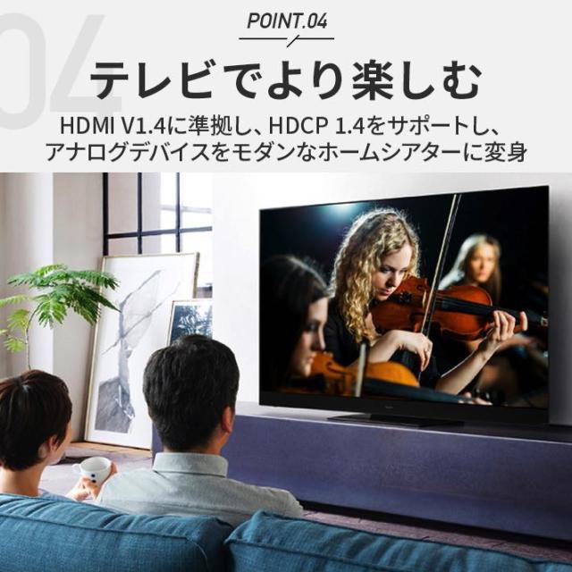 HDMI V1.4に準拠し、HDCP1.4をサポートします。 古いアナログデバイスをモダンなホームシアターにシームレスに統合し、ユーザーは必要なモニターで大きな画像やビデオを楽しむことができます。
