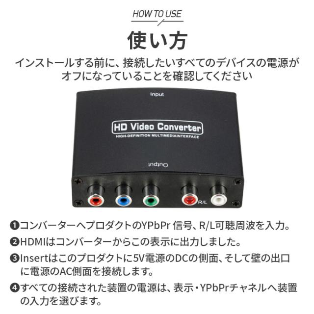 1. Connect コンバーターへのこのプロダクトの YPbPr 信号そして R/L 可聴周波を入力します