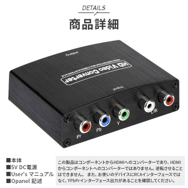 このコンポーネント (入力) から HDMI (出力) コンバーターは、アナログYPbPrビデオとR/Lオーディオ信号をHDMI出力に変換し、古いDVDプレーヤーやサットボックスやXbox Oneなどのコンソールを新しいHDMIディスプレイに接続することができます。 注意: この製品はコンポーネントからHDMIへのコンバーターであり、HDMIからコンポーネントへのコンバーターではありません。逆転させることはできません。 また、お使いのデバイスにRCAインターフェースではなく、YPbPrインターフェース出力があることを確認してください。