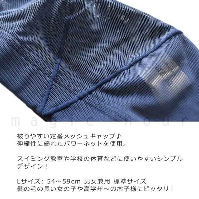 Lサイズ:大人向けフリー 頭囲 54〜59cm (10才から) 伸縮性に優れたパワーネットを採用したメッシュキャップ♪ 被りやすい定番タイプ、スイミングスクールや学校の体育などに使いやすい定番シンプルデザイン! 男女兼用サイズ、10才位のお子様から標準サイズの大人向け。 |