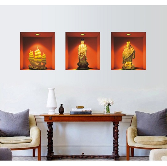 ウォールステッカー 仏像 帆船 3D インテリアシール 3枚セット 糊残りなし 和室 畳間 仏壇 階段 カフェ 風水 PVC材質 貼り方 剥がし方