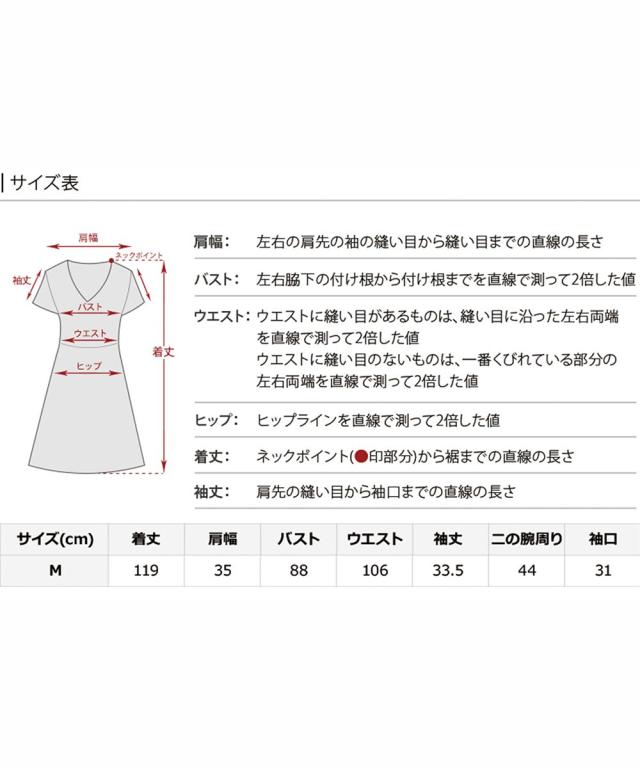 M/着丈119|肩幅35|身幅44|ウエスト幅53|袖丈33.5|二の腕周り44|袖口31