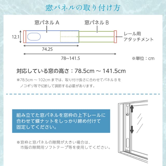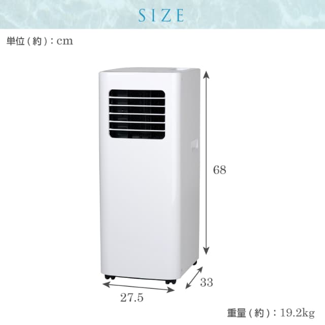 | 付属品 | 排熱ダクト(約40〜120cm)伸縮式×1 / ダクトエンドA・B×各1 / 窓パネルA・B×各1 / レール用アタッチメント×2 / ネジ×4 / 四角ボルト×1 蝶ナット×1 / ドレンホース×1 / リモコン×1 |