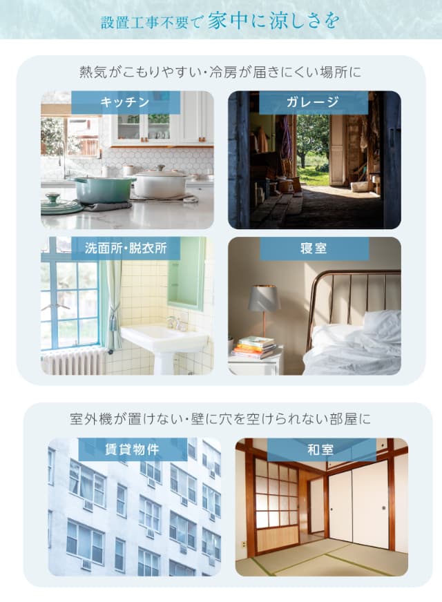 キッチンでの調理中や風呂上がりのドライヤーなど、短時間スポットで冷風を浴びる使用方法や、ガレージなど排熱が拡散する環境ではあまり問題になりませんが、閉め切った室内を冷やす目的の場合は排熱を外に逃がす必要があります。