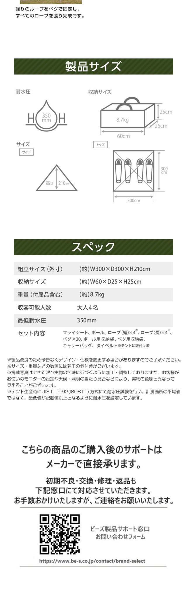 * セット内容: フライシート、ポール、ロープ(短)×4(※) 、ロープ(長)×4(※)、ペグ×20、ポール用収納袋、ペグ用収納袋、キャリーバッグ、タイベルト