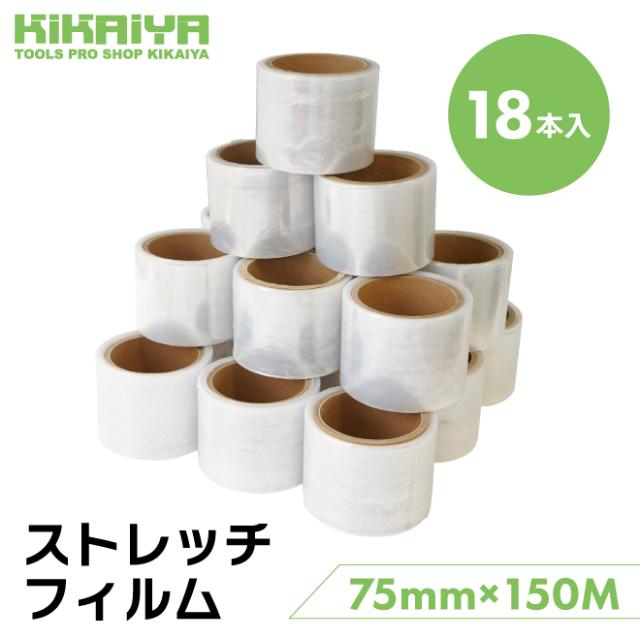 ストレッチフィルム 厚さ15ミクロン 幅75mm×150m巻 1箱 18本入 手巻きラップ 業務用 養生 梱包 透明 KIKAIYA