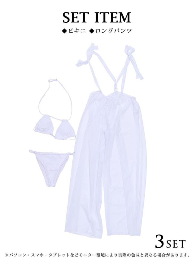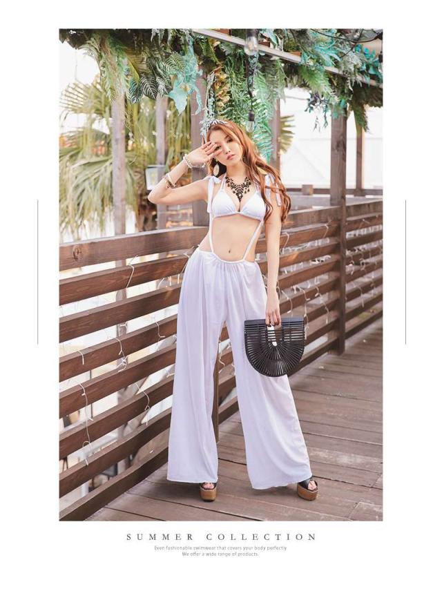 ☆ホワイトワンカラーでシンプルなデザインの三角ビキニとサロペット風パンツが3点セットになったレディース水着。