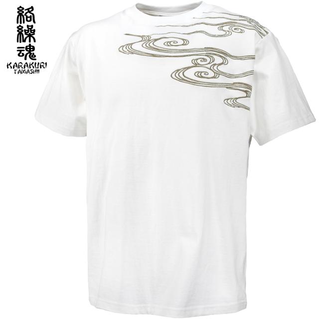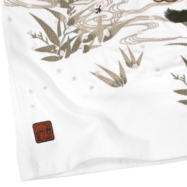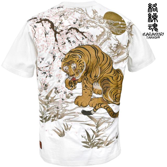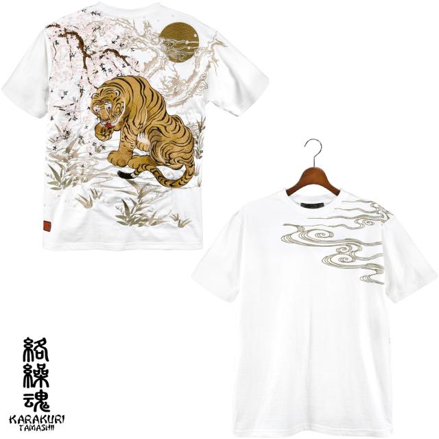 からくり魂 絡繰魂 粋 Tシャツ 半袖 クルーネック 虎図 若冲 和柄 刺繍 メンズ mens(ホワイト白) 232035