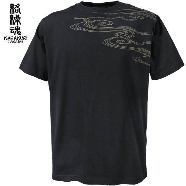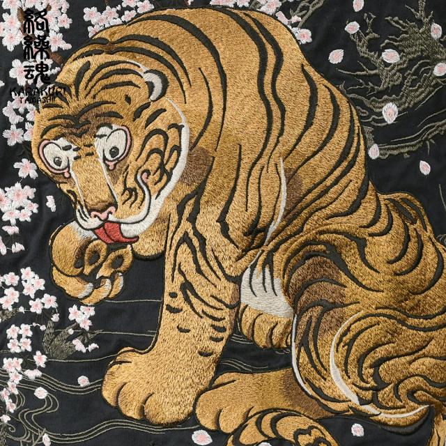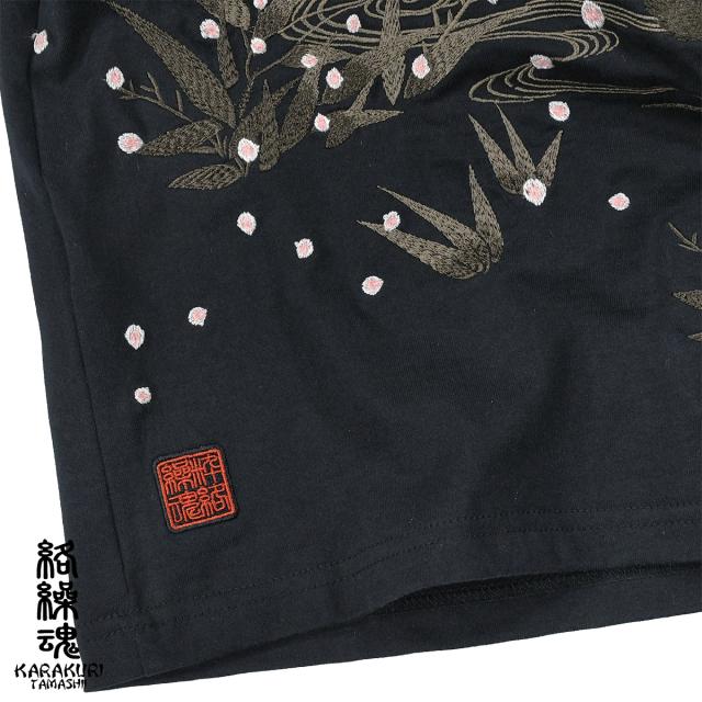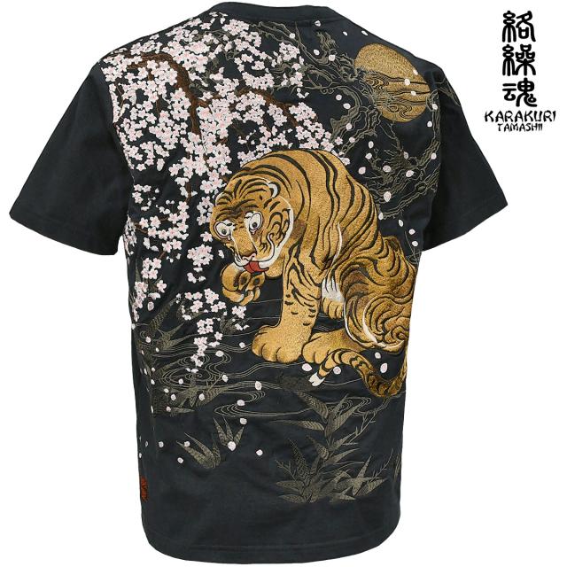 からくり魂 絡繰魂 粋 Tシャツ 半袖 クルーネック 虎図 若冲 和柄 刺繍 メンズ mens(黒ブラック黄虎) 232035