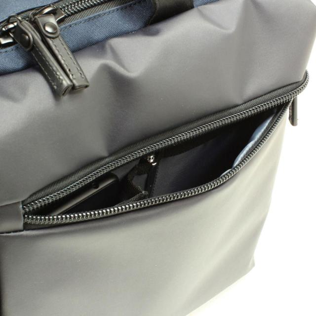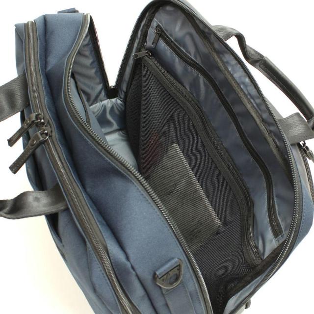 二層式の前面側メインルームはスマートフォンやデジタルガジェット類の収納に便利なマルチポケットレイアウト。(前面側にファスナーポケット×1・その手前にメッシュファスナーポケット×1、背面側にオープンポケット×2)荷物を細かく整理整頓して、ビジネスツールも効率よく収納することが可能です。