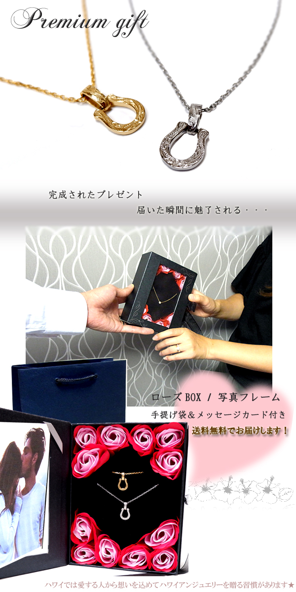 ペアネックレス ペアハワイアンジュエリー ミニチュア ホースシュー 馬蹄 金属アレルギー対応 サージカル ステンレス 花 入浴剤 写真フレーム フラワー