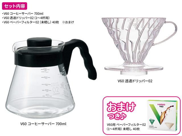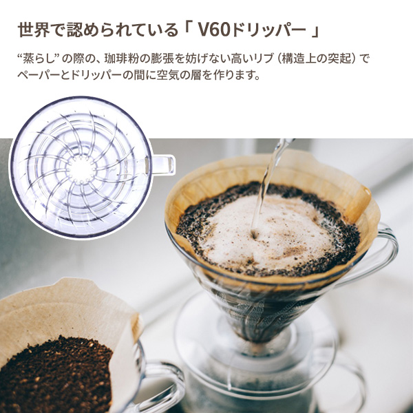 世界中で愛用されている、円すい形「V60」ドリッパー【02タイプ】と、フタをしたまま電子レンジにかけられる、耐熱ガラス製のコーヒーサーバー(実用容量700ml)。とのセット。