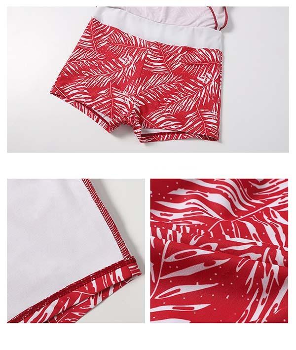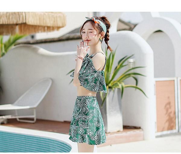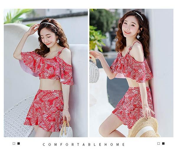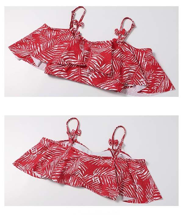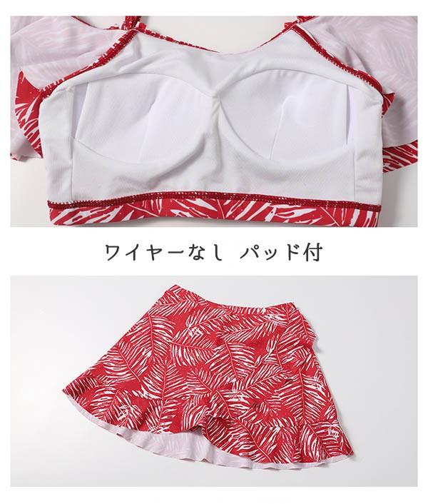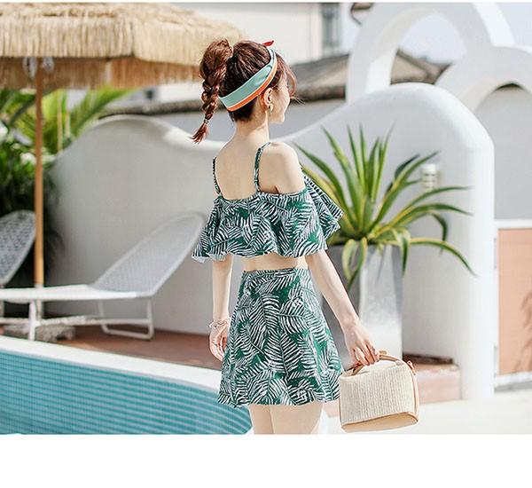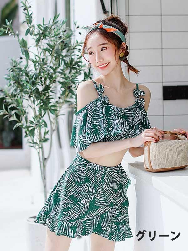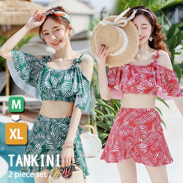【レビュー投稿で+5%還元】フレア水着 タンキニ レディース オフショルダー 半袖付き キャミソール インナーパンツ ハイウエスト ボーイレッグ ワイヤーなし パッド付 ボタニカル柄 リーフ 葉っぱ 体型カバー セパレート 海 プール リゾート おしゃれ ぽっちゃり 韓国風